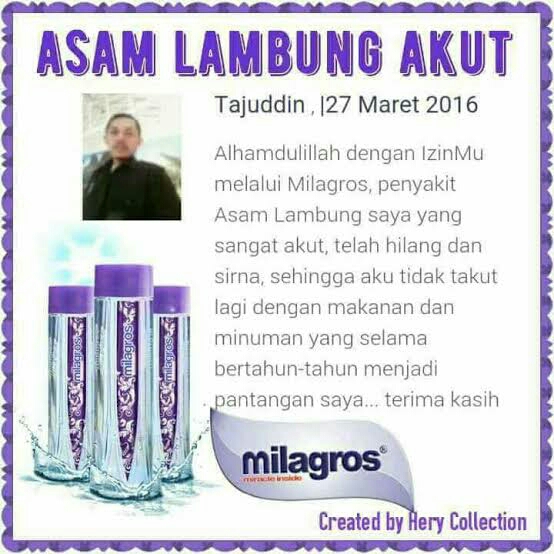 Milagros adalah air minum yg memiliki kelebihan bisa membersihkan toxin dalam darah. Selain itu milagros juga memiliki sifat Alkali(basa) yg berguna untuk menyeimbangkan kadar asam berlebih, sehingga cocok digunakan sbg media terapi sakit maag