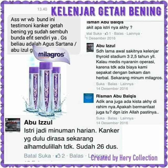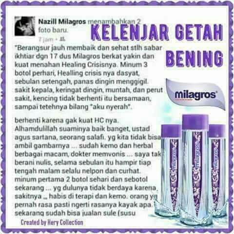 Di bawah ini adalah beberapa tertimoni dari orang² yg sudah disembuhkan Alloh SWT dari pembengkakan kelenjar getah bening dgn perantara milagros