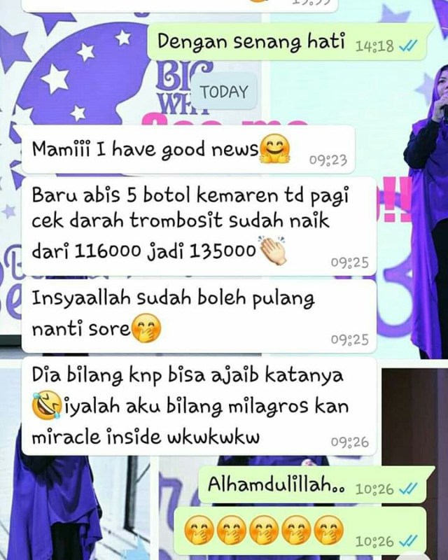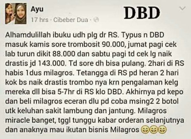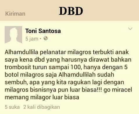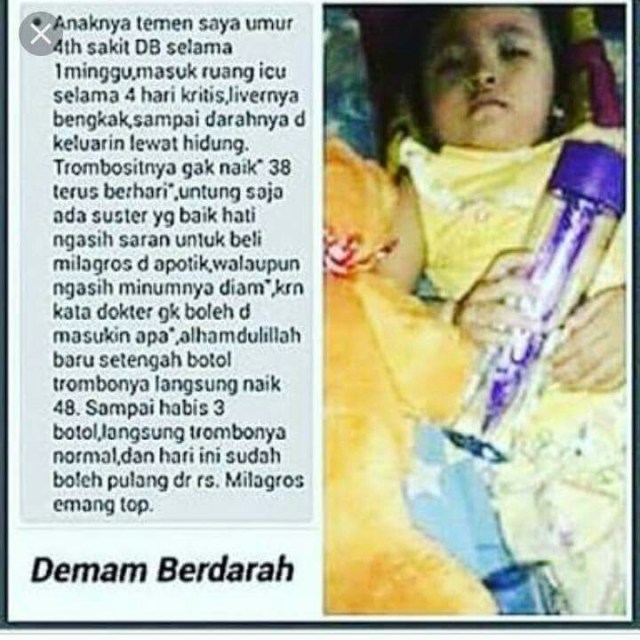 Oleh karena itu milagros dg scalar energy dan antioksidan nya yg kuat akan mampu menutup kebocoran dinding kapiler tsb.sehingga jumlah trombositnya cepat naik kembali.