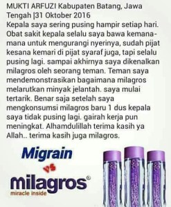 Milagros akan membantu proses penyembuhan Migrain di menghentikan reaksi inflamasi atau peradangan di jaringan otak yg terjadi karena adanya trigger atau faktor pencetus .
