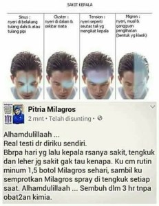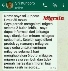Di bawah ini adalah beberapa testimoni dari orang² yg telah di sembuhkan Alloh SWT dari migrain dengan perantara milagros